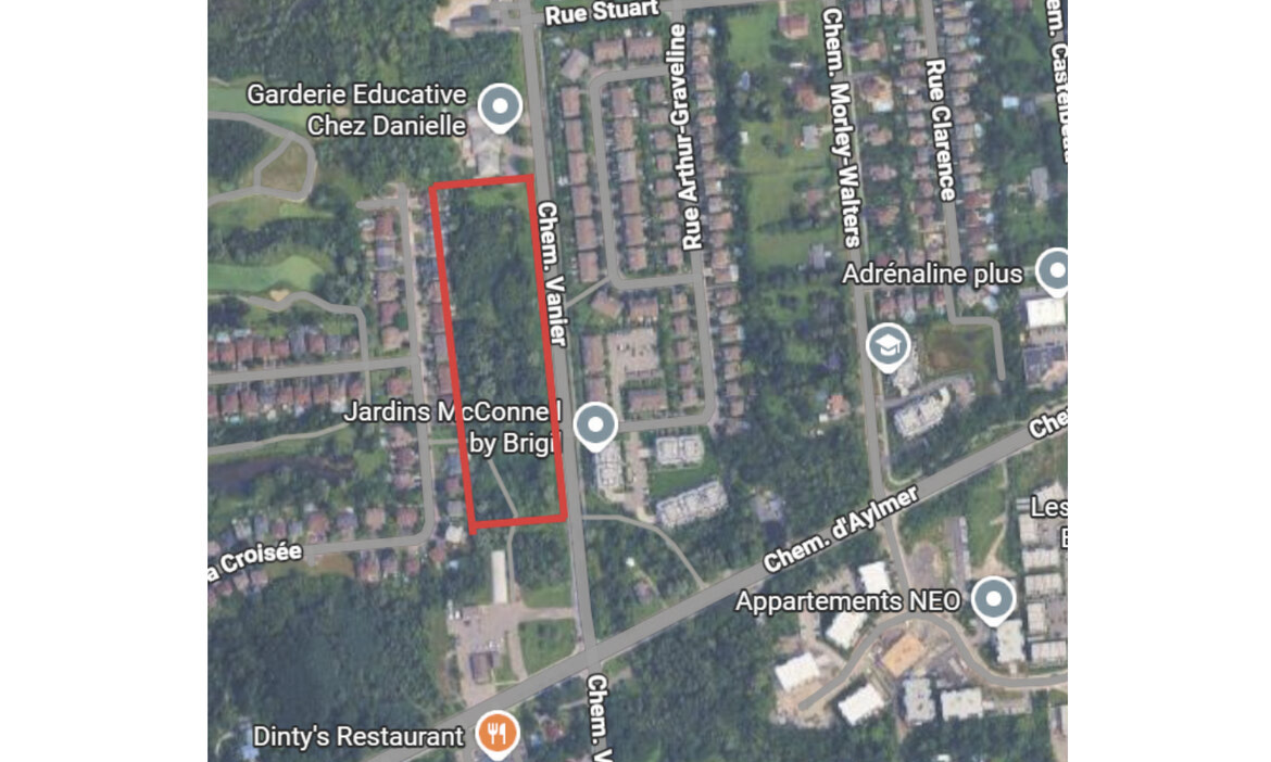 Une demande de dérogation mineure a été présentée à la Ville afin de permettre la construction de huit bâtiments de quatre étages, comptant 36 logements chacun, sur des lots distincts du chemin Vanier. Les bâtiments auront pour adresses les 230, 240, 250, 260, 270, 280, 290 et 294, chemin Vanier. Le terrain ciblé, situé entre le chemin d’Aylmer et la rue Stuart, est présentement une zone boisée.