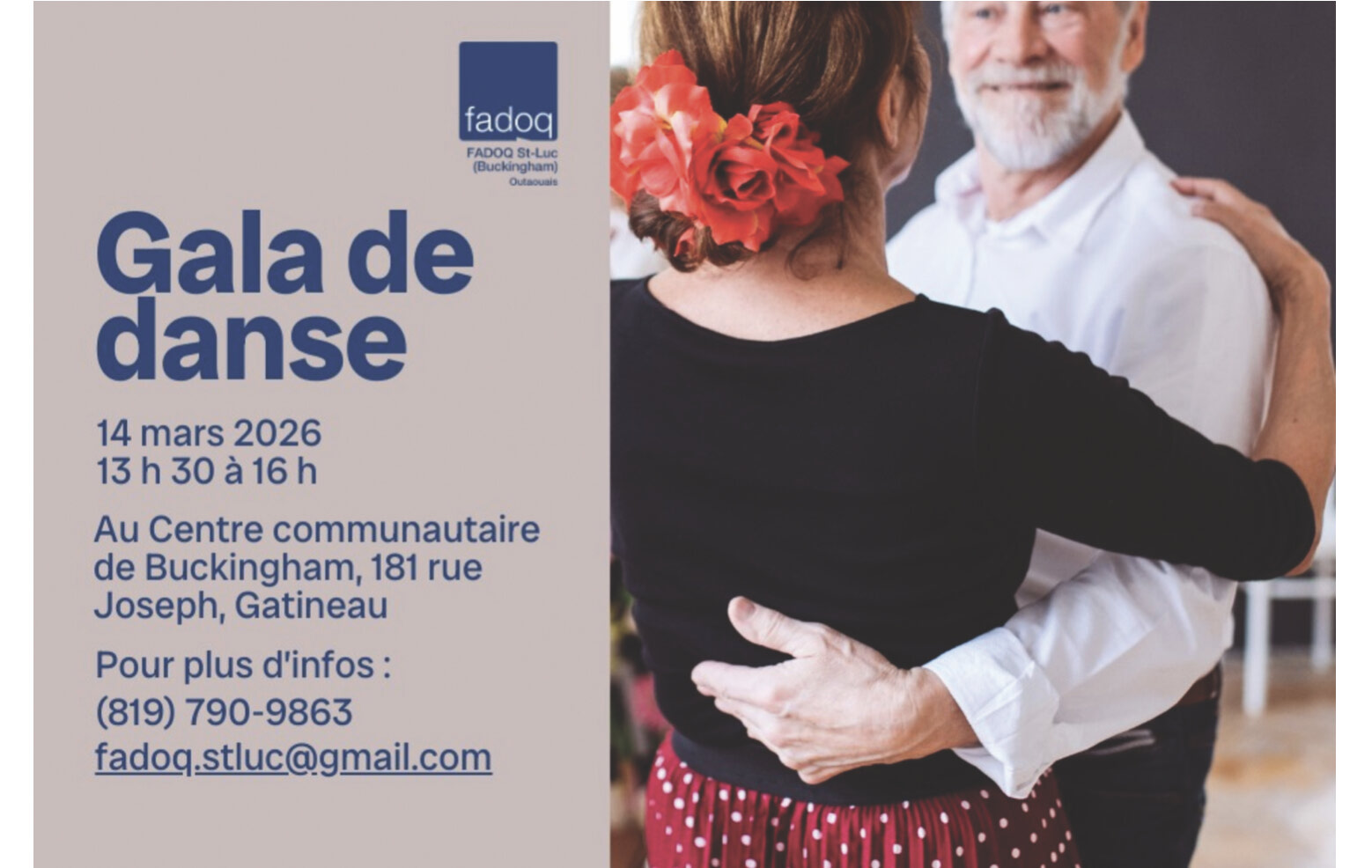 Les amoureux de la danse auront encore de quoi se réjouir, cette année, grâce au gala de danse organisé par le club de la Fédération de l’Âge d’Or du Québec (FADOQ) St-Luc Buckingham et financé par la FADOQ de l’Outaouais. Ouvert aux membres de la région, l’événement aura lieu au Centre communautaire de Buckingham, situé au 181, rue Joseph de 13 h 30 à 16 h le samedi 14 mars prochain.