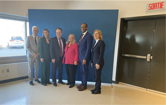 Ottawa is investing $3.6 million in the Université du Québec en Outaouais to establish a cyber range where defence suppliers can simulate and rehearse responses to cyberattacks targeting military supply chains. Stéphane Lauzon, Maude Marquis-Bissonnette, Steven MacKinnon, Murielle Laberge, Greg Fergus and Sophie Chatel. Photo: DEC