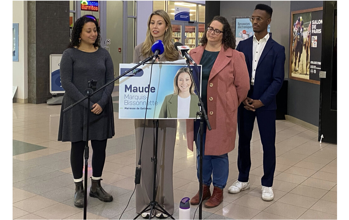 Maude Marquis-Bissonnette, current mayor of Gatineau and mayoral candidate for Action Gatineau, held a press conference at the Galeries Aylmer to announce her party's plans for sports infrastructure and culture if elected. She was joined by Action Gatineau candidate for Lucerne, Sonia Ben-Arfa along with candidate for Buckingham Mike Owen, and Isabelle N. Miron candidate for L’Orée-du-Parc.