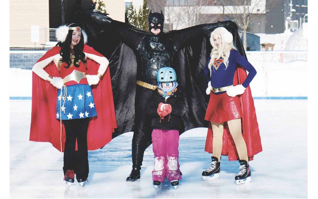 Le jeune Noäm Prost Brossard, 6 ans, pose avec Wonder Woman, Superwoman et Batman, lors de l'événement 'Patine avec des super-héros' tenu à la Patinoire réfrigérée de la Marina d’Aylmer, le dimanche 1 février 2026. L'activité familiale et gratuite a été organisée par le groupe 'Noël dans le Vieux Aylmer'. C'est le dernier événement du groupe, jusqu'à l'hiver prochain.