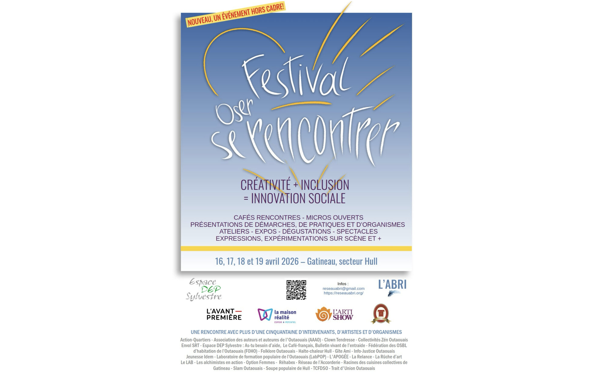 Le secteur Hull accueillera pour la toute première fois un nouveau festival créatif et inclusif : « Oser se rencontrer. » Organisé par l’Espace DEP Sylvestre, en collaboration avec son association Accueil des blessures relationnelles invisibles (ABRI), cet événement vise à briser l’isolement social grâce à des conférences, des activités et des ateliers artistiques qui se tiendront du 16 au 19 avril 2026.